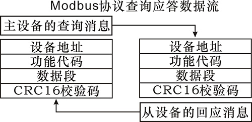 主机查询:查询消息帧包括设备地址、功能代码、数据信息码、校验码。地址码表明要选中的从机设备;功能代码告之被选中的从设备要执行何种功能,例如功能代码03或04 是要求从设备读寄存器并返回它们的内容;数据段包含了从设备要执行功能的任何附加信息,校验码用来检验一帧信息的正确性,从设备提供了一种验证消息内容是否正确的方法,它采用CRC16 的校准规则。